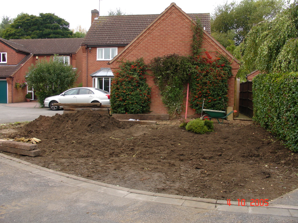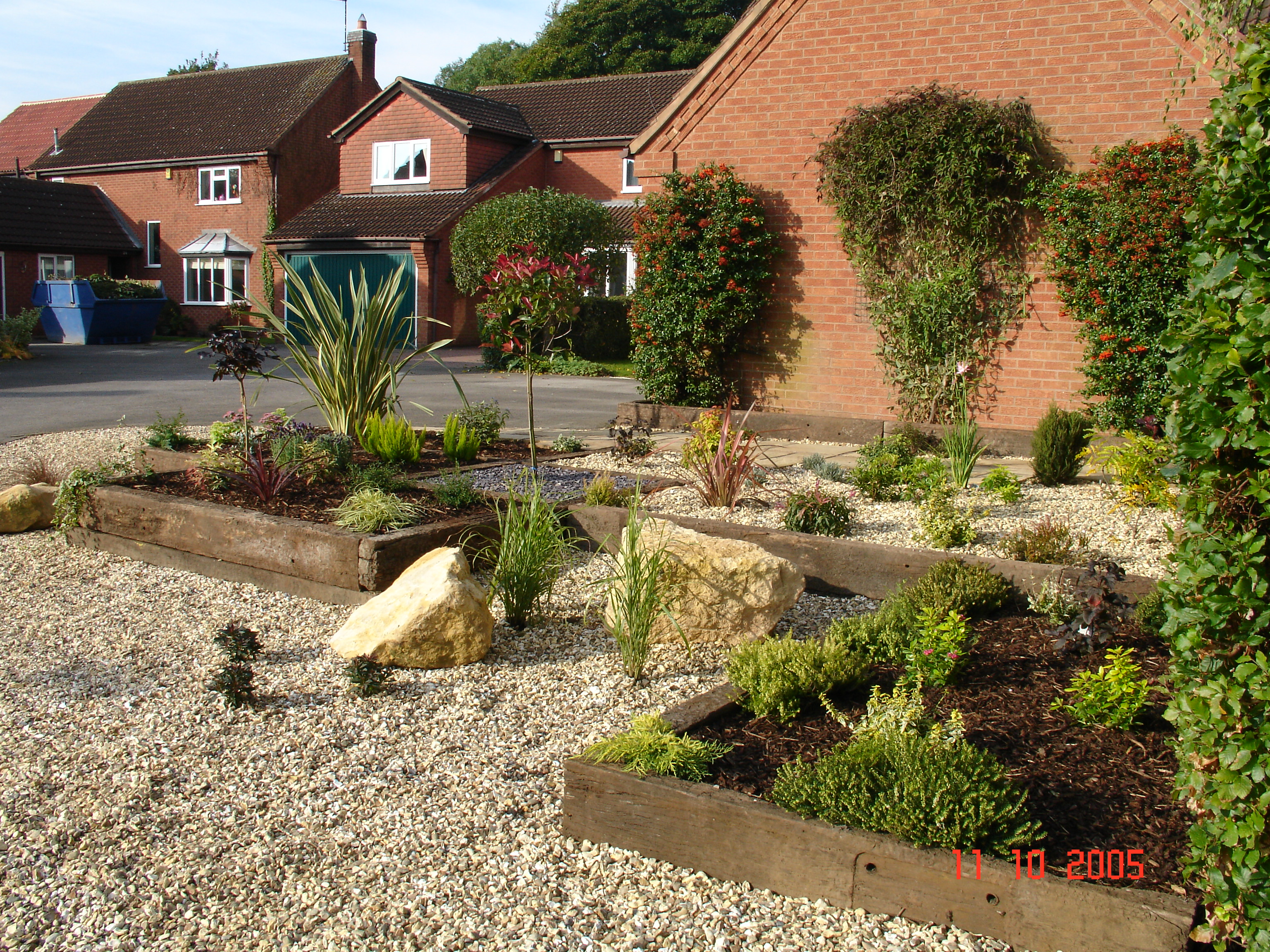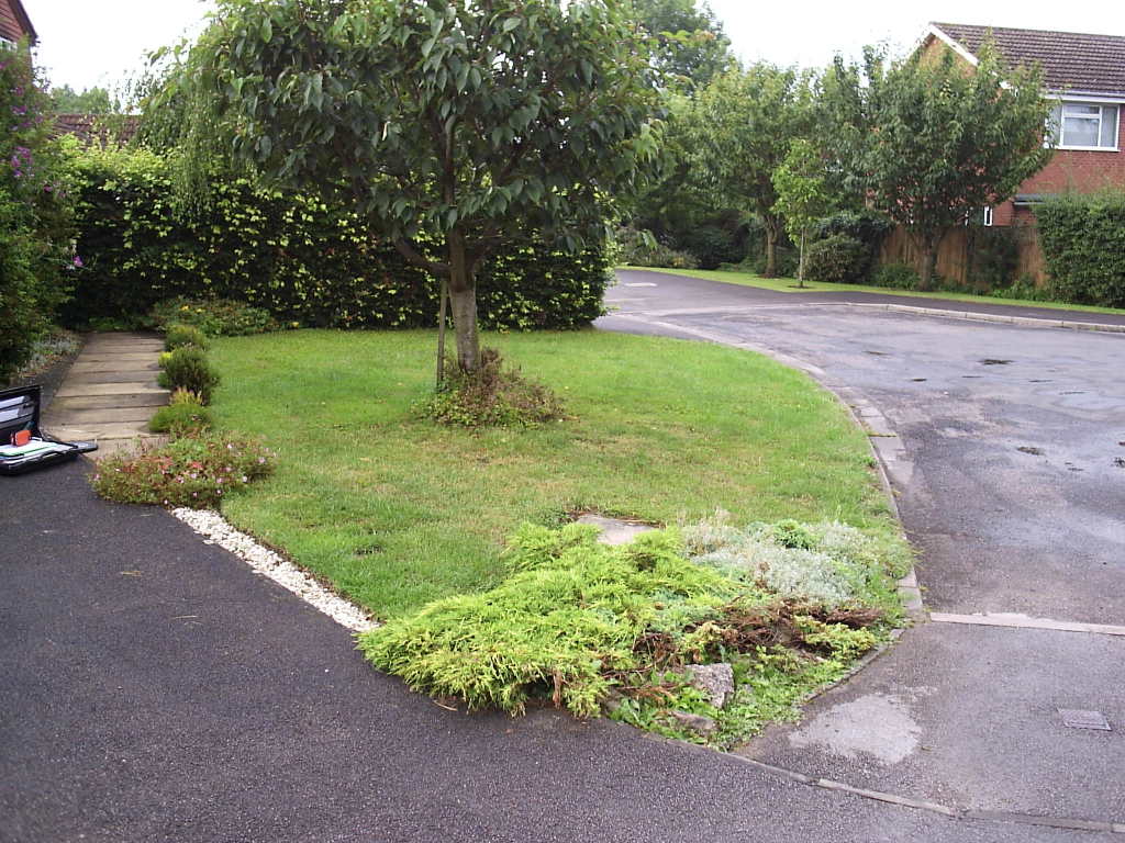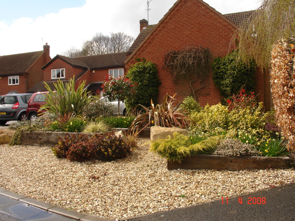 The client had a small patch of sloping grass at the front of the property which had a very old and ‘unsaveable’ Cherry growing in it. My solution was to remove all the grass, terrace the ground using reclaimed sleepers and then use gravel as ground cover. Planting with a suitable mixture of plants and bulbs to give year round interest completed the project which looked stunning at the head of a small road.